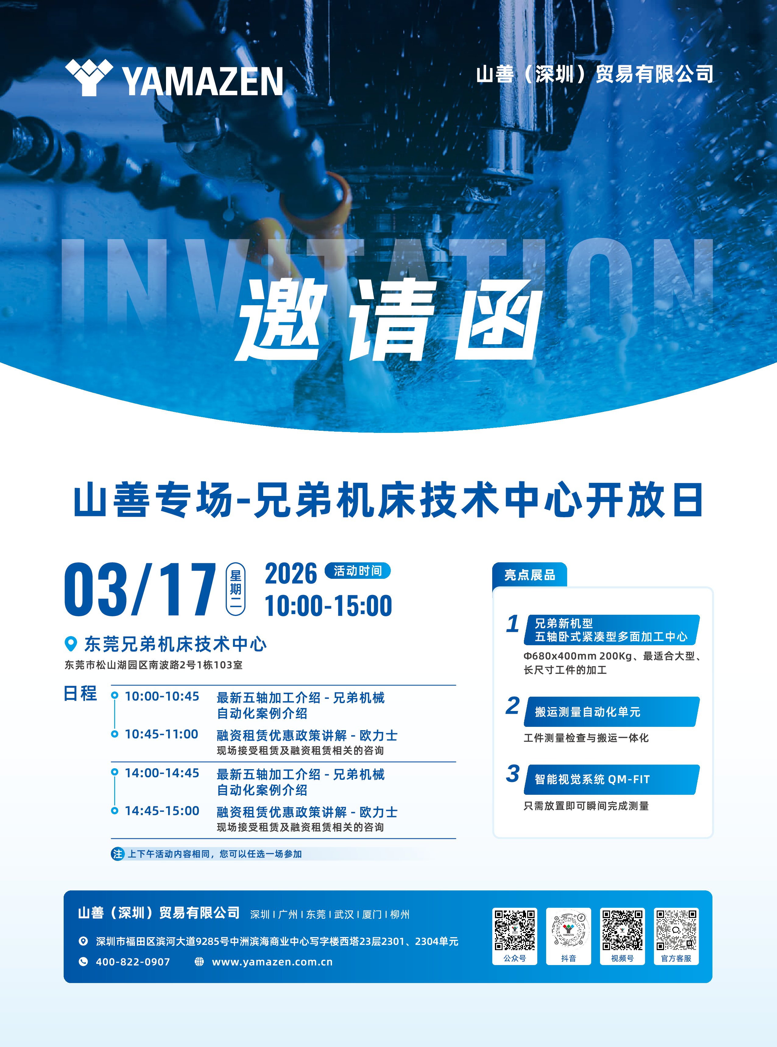 智造升级机遇来袭!3 月 17 日,山善专场・兄弟机床技术中心开放日将在东莞松山湖兄弟机床技术中心启幕,邀您共探高端加工技术,解锁五轴加工与自动化智造的核心密码。现场不仅有欧力士专属融资租赁优惠政策专业解读,更有多款明星展品、前沿技术方案重磅亮相,上下午两场活动可随心选择,诚邀行业同仁莅临交流,共话智造未来!