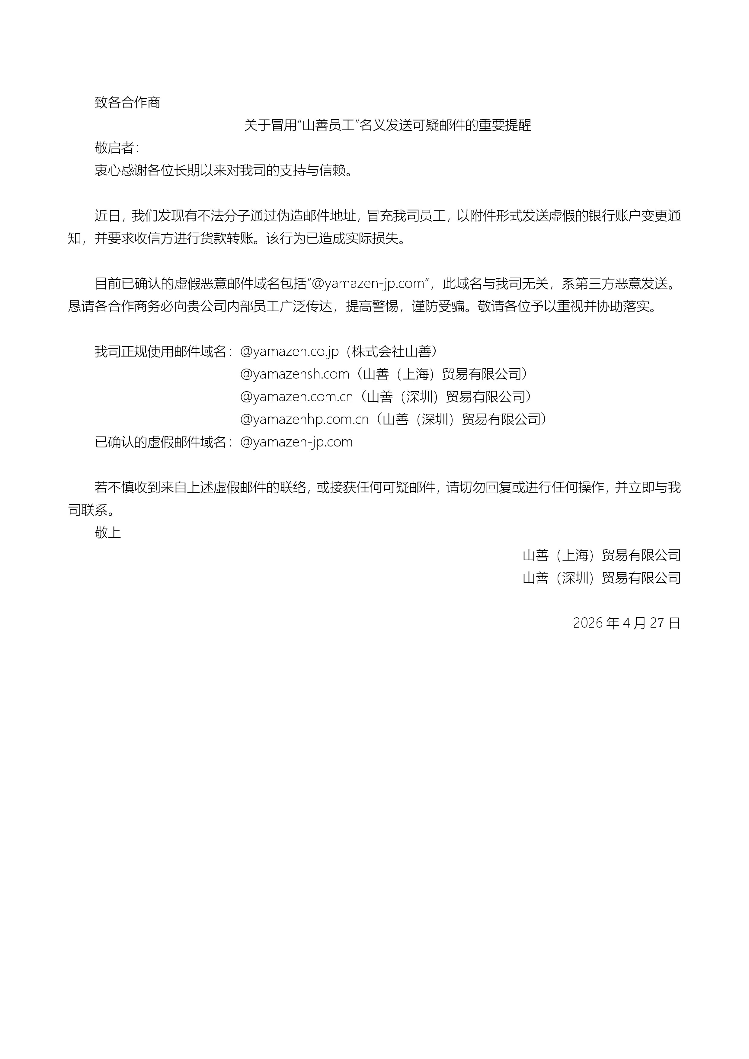关于冒用“山善员工”名义发送可疑邮件的重要提醒